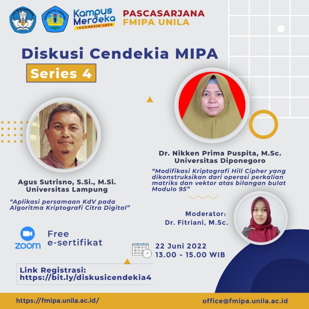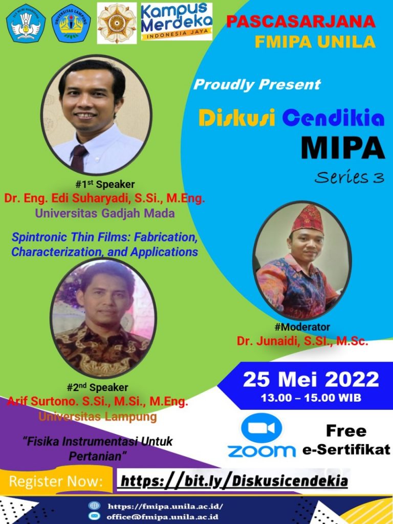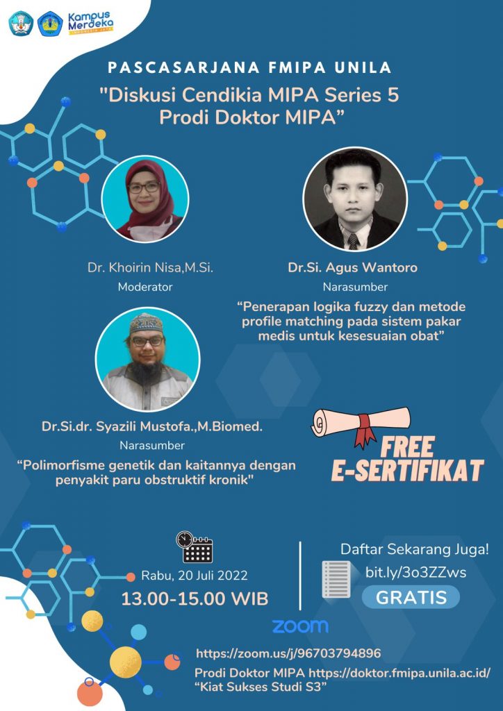 Kegiatan Diskusi Cendikia MIPA (DCM) merupakan agenda rutin bulanan Fakultas MIPA Universitas Lampung yang diadakan secara online dalam bentuk webinar dan dikelola oleh Program-program Studi Pascasarjana di lingkungan FMIPA. Untuk bulan Mei – Juli 2022 (DCM seri ke-3-5) menghadirkan narasumber dari mahasiswa dan alumni Program Studi Doktor MIPA. Berikut nama narasumber dari Prodi Doktor MIPA untuk setiap seri.